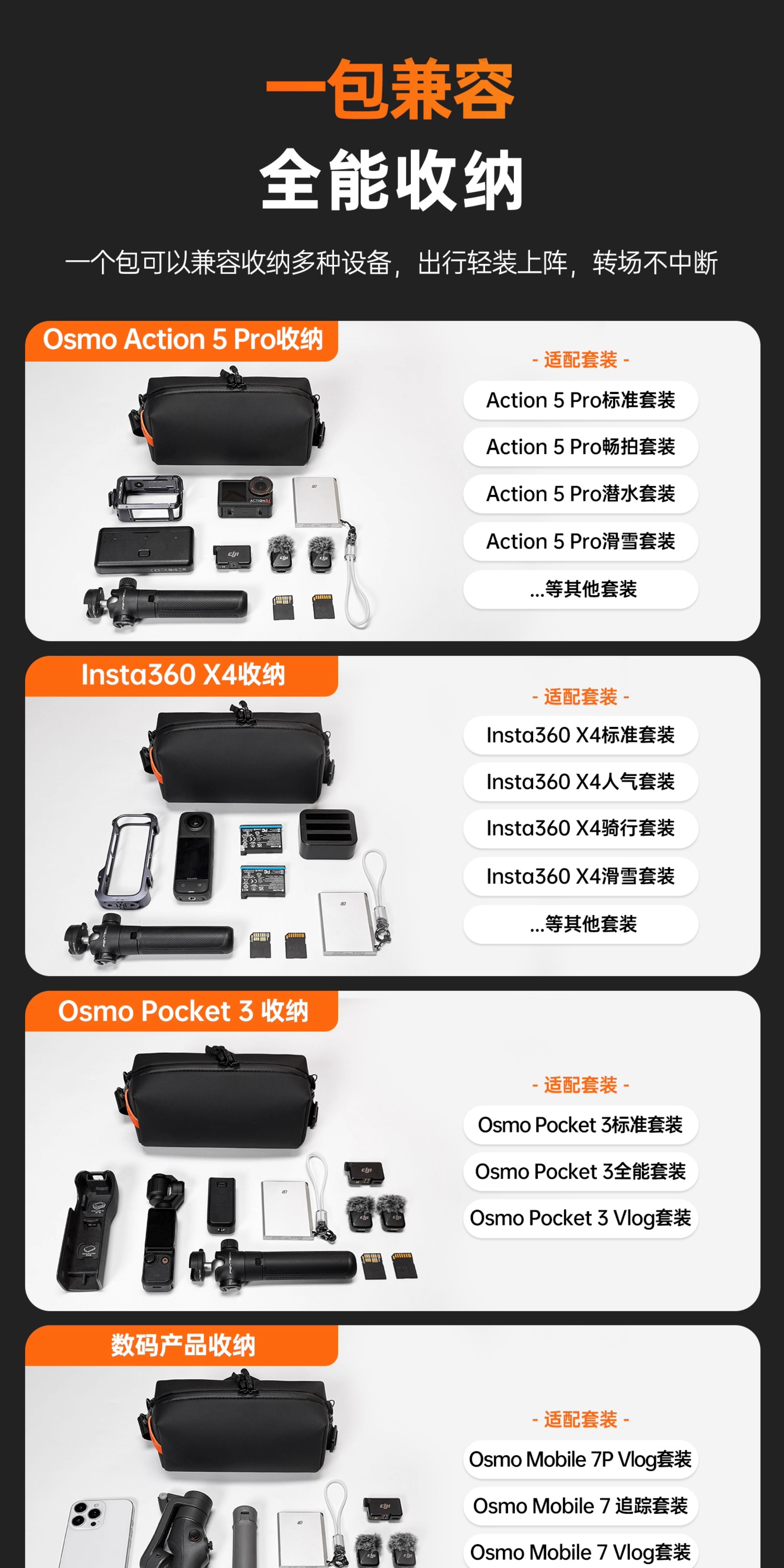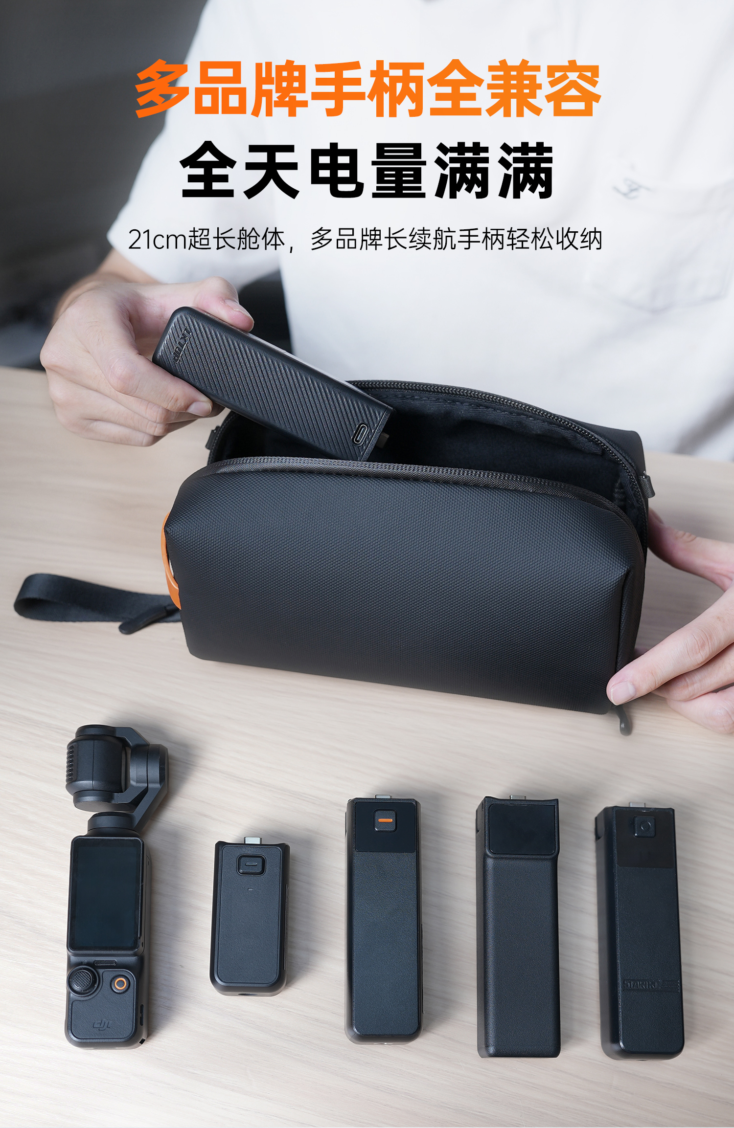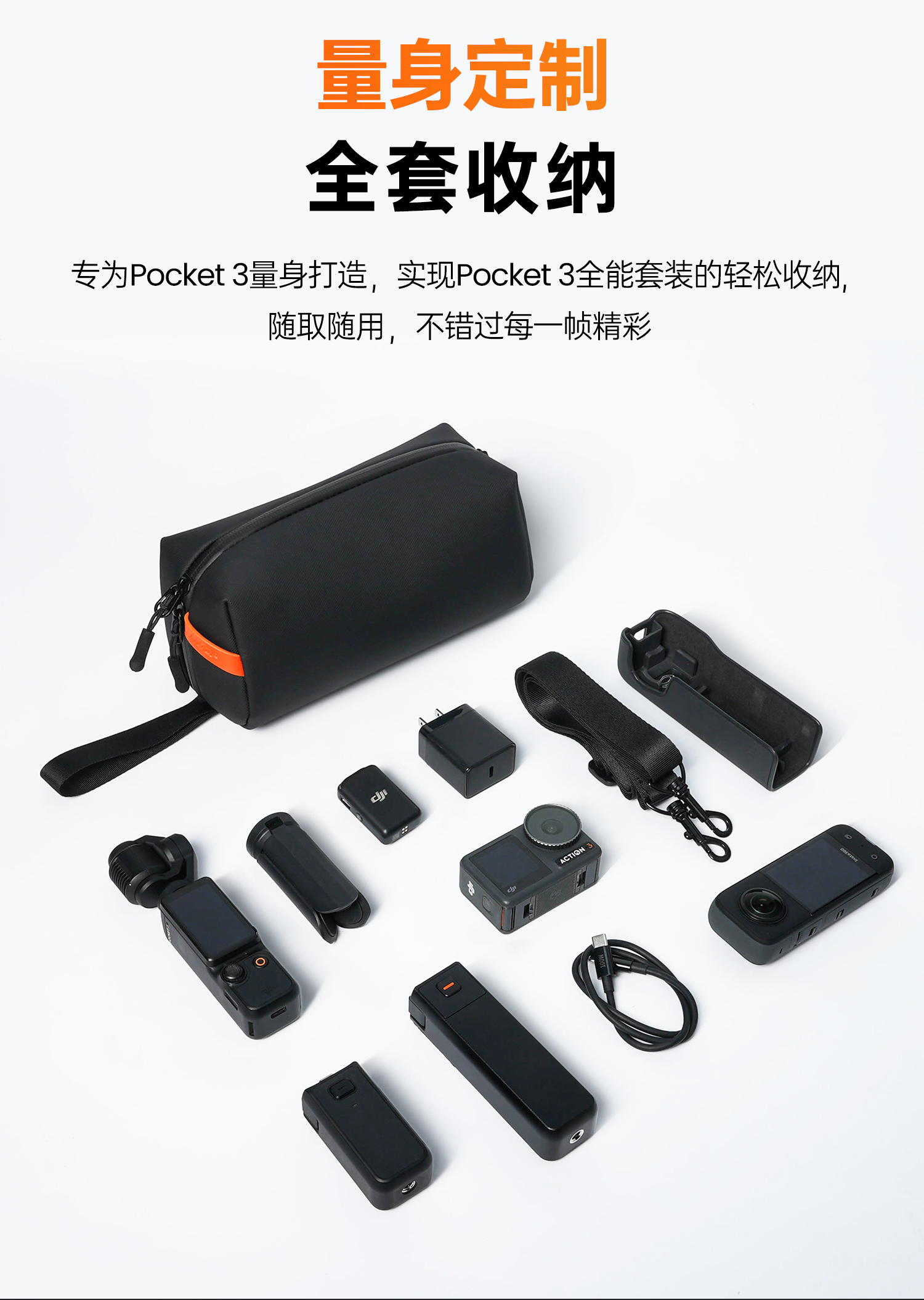 專位運動相機設計的收納包,可同時收納多種設備,21公分超長體積,立體隔層分區,重量僅196g,內層軟絨保護,出行便利。
