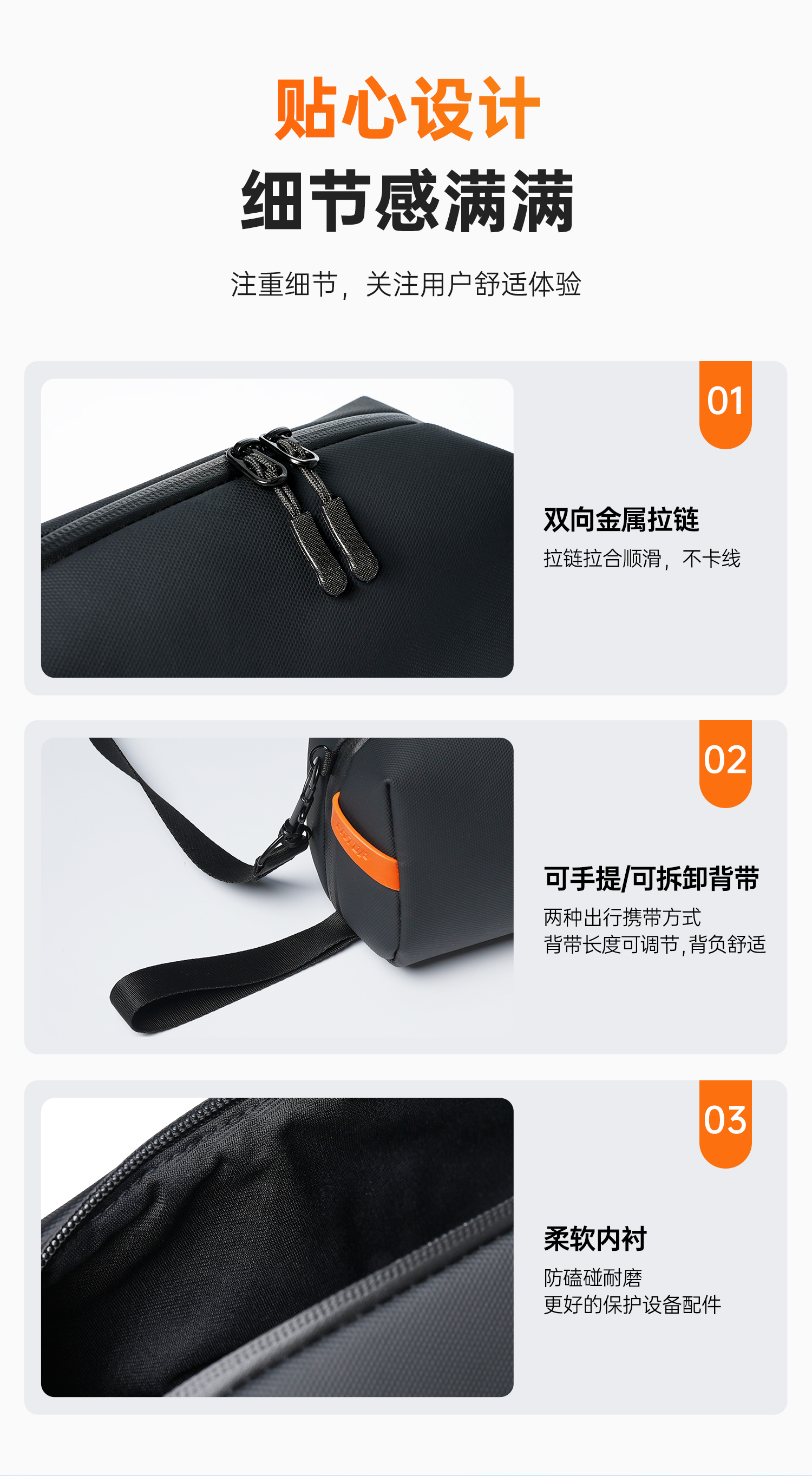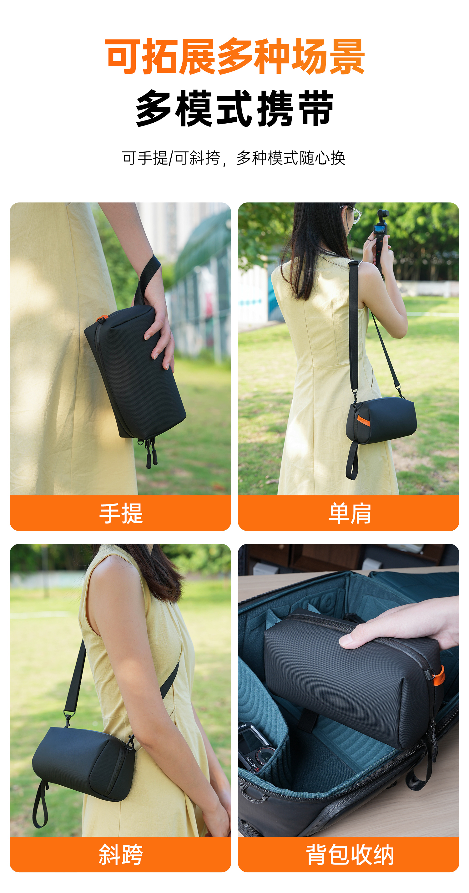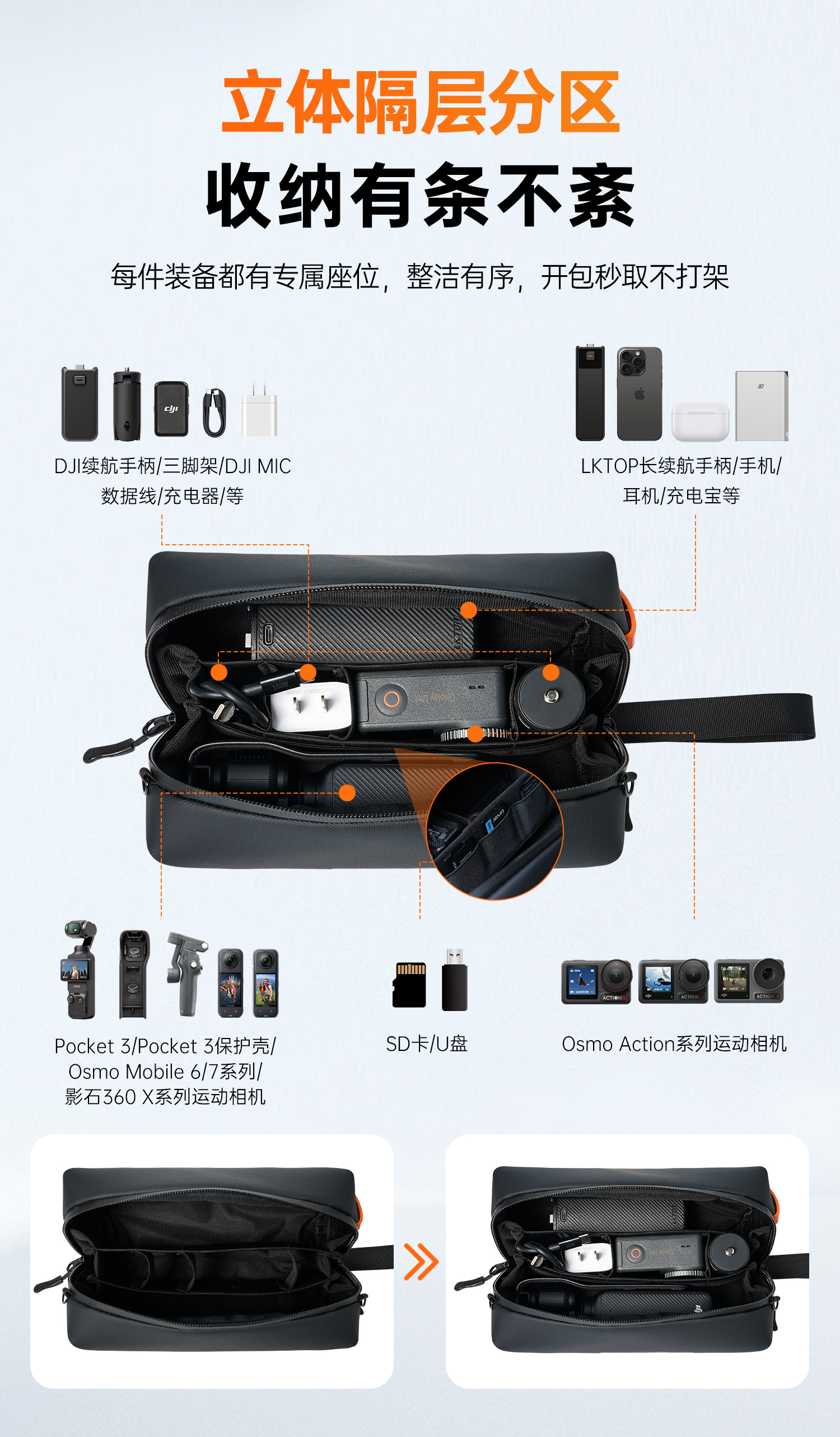 專位運動相機設計的收納包,可同時收納多種設備,21公分超長體積,立體隔層分區,重量僅196g,內層軟絨保護,出行便利。